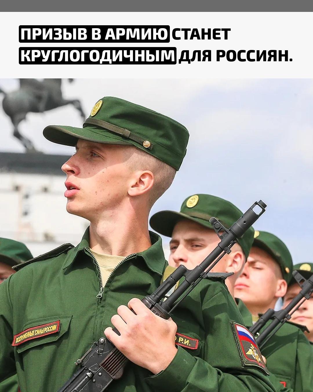 Правительство поддержало законопроект, согласно которому россиян теперь будут призывать в армию в течение всего года. Призывники обязаны проходить медкомиссию, психологические тесты и заседания комиссии без привязки к конкретному периоду.
