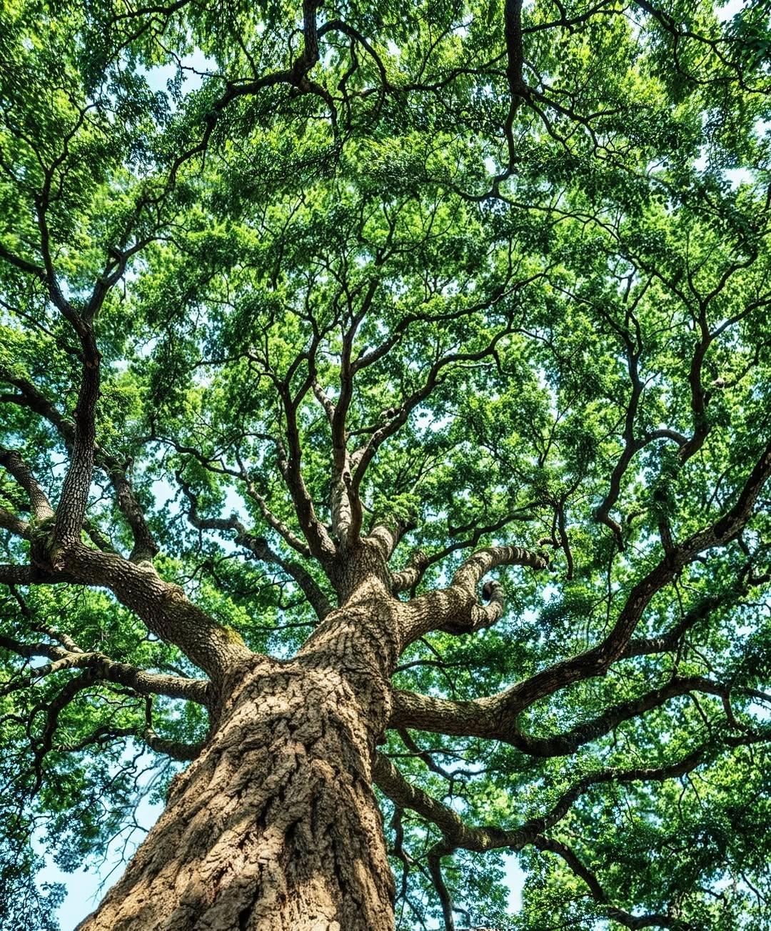 Это не ИИ-картина — это вид из-под древнего дуба. Ему более 400 лет. Когда смотришь вверх, переплетенные ветви создают возвышающийся зал света и жизненных сил — собственный грандиозный шедевр природы.