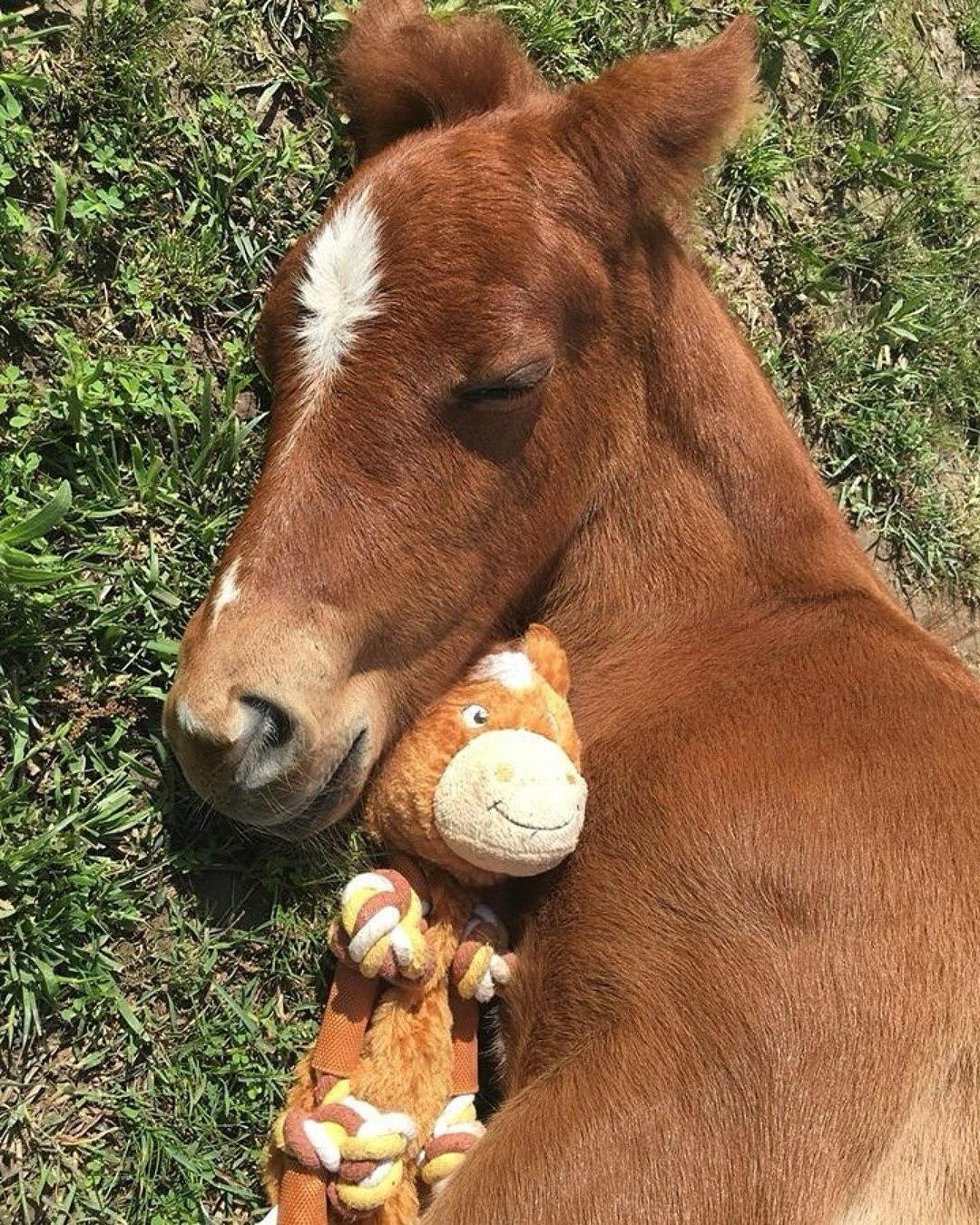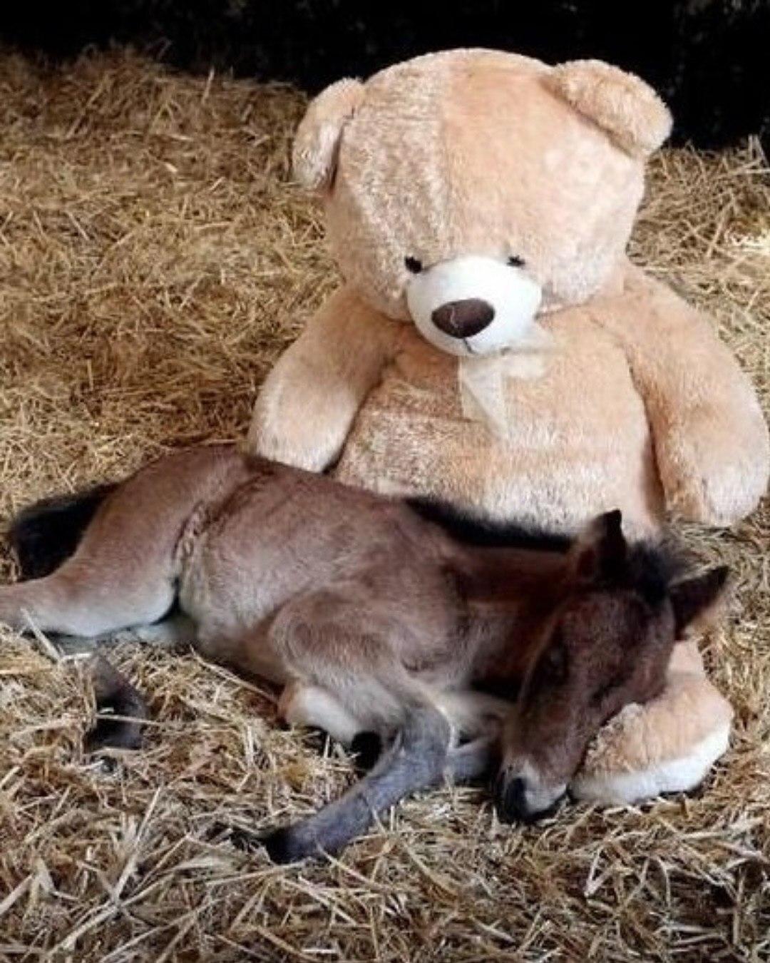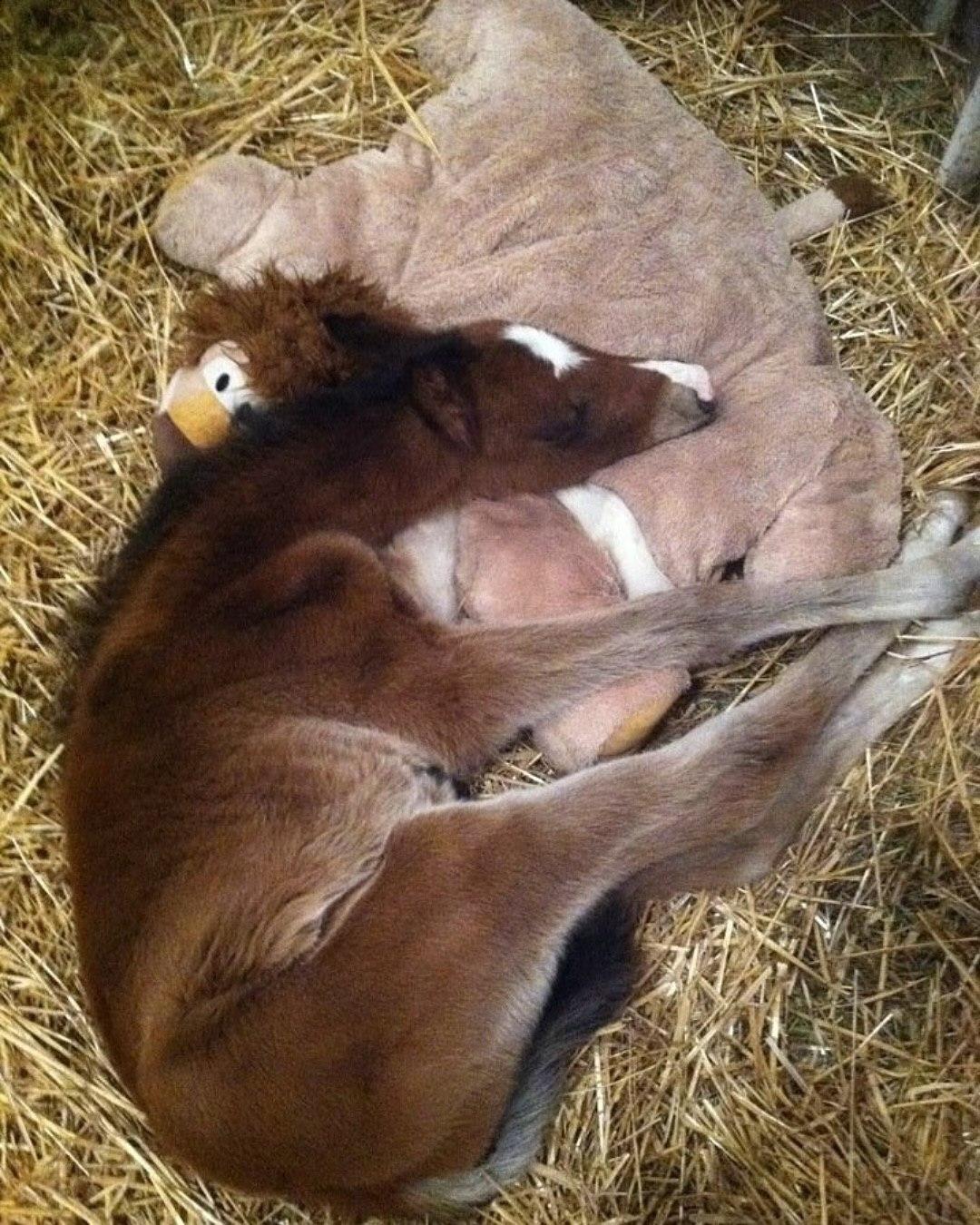 Плюшевых друзей дают и осиротевшим жеребятам — малыши обнимают их и спят, словно рядом настоящая мама.