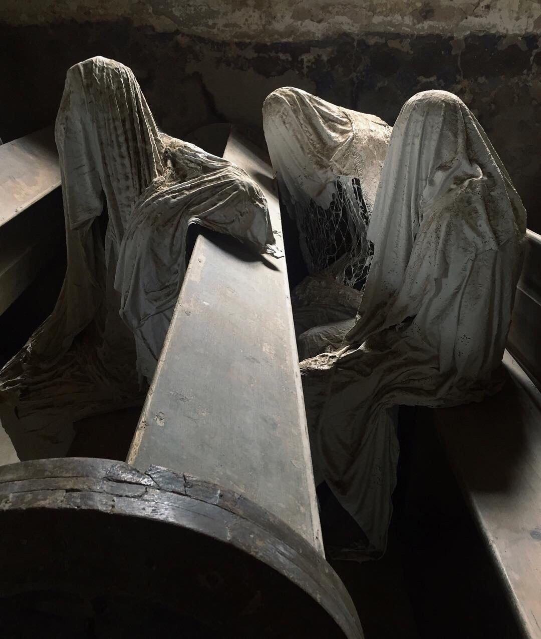 В заброшенной церкви в чешском селе Лукoва он разместил призрачные фигуры прихожан, созданные из гипса и ткани. Они сидят на скамьях, склоненные в молитве, будто застыли между мирами.