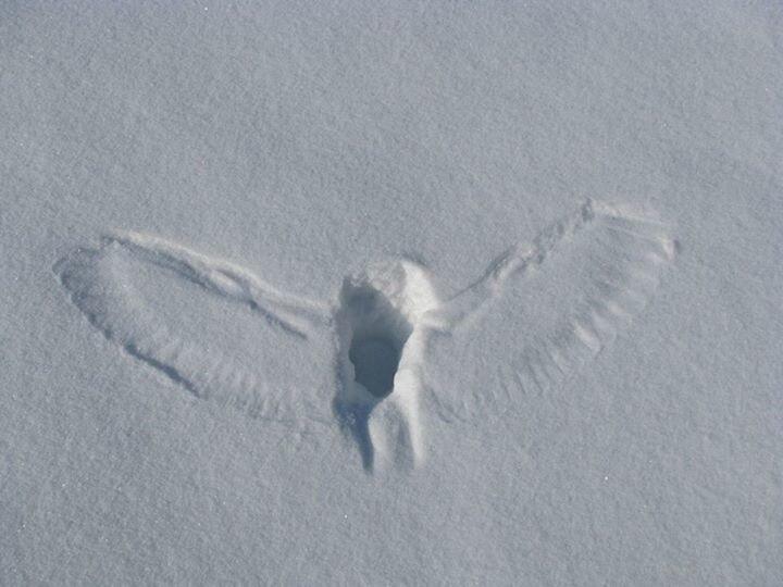 Совы оставляют отпечатки снежных ангелов во время зимней охоты, когда пикируют вниз, чтобы поймать мышей или белок.