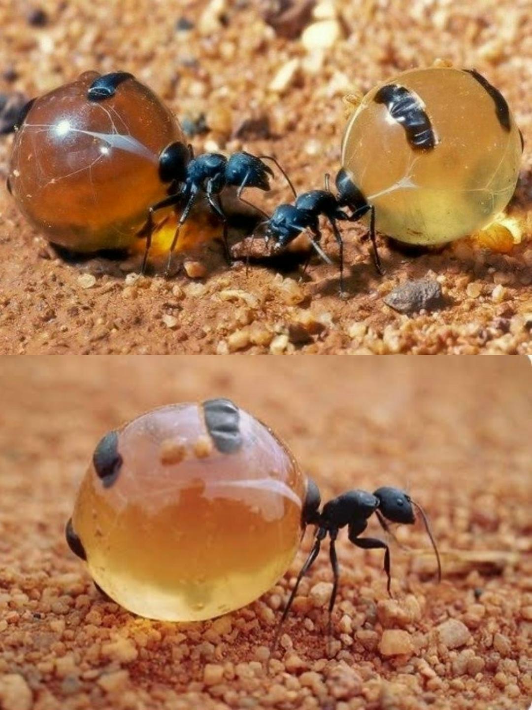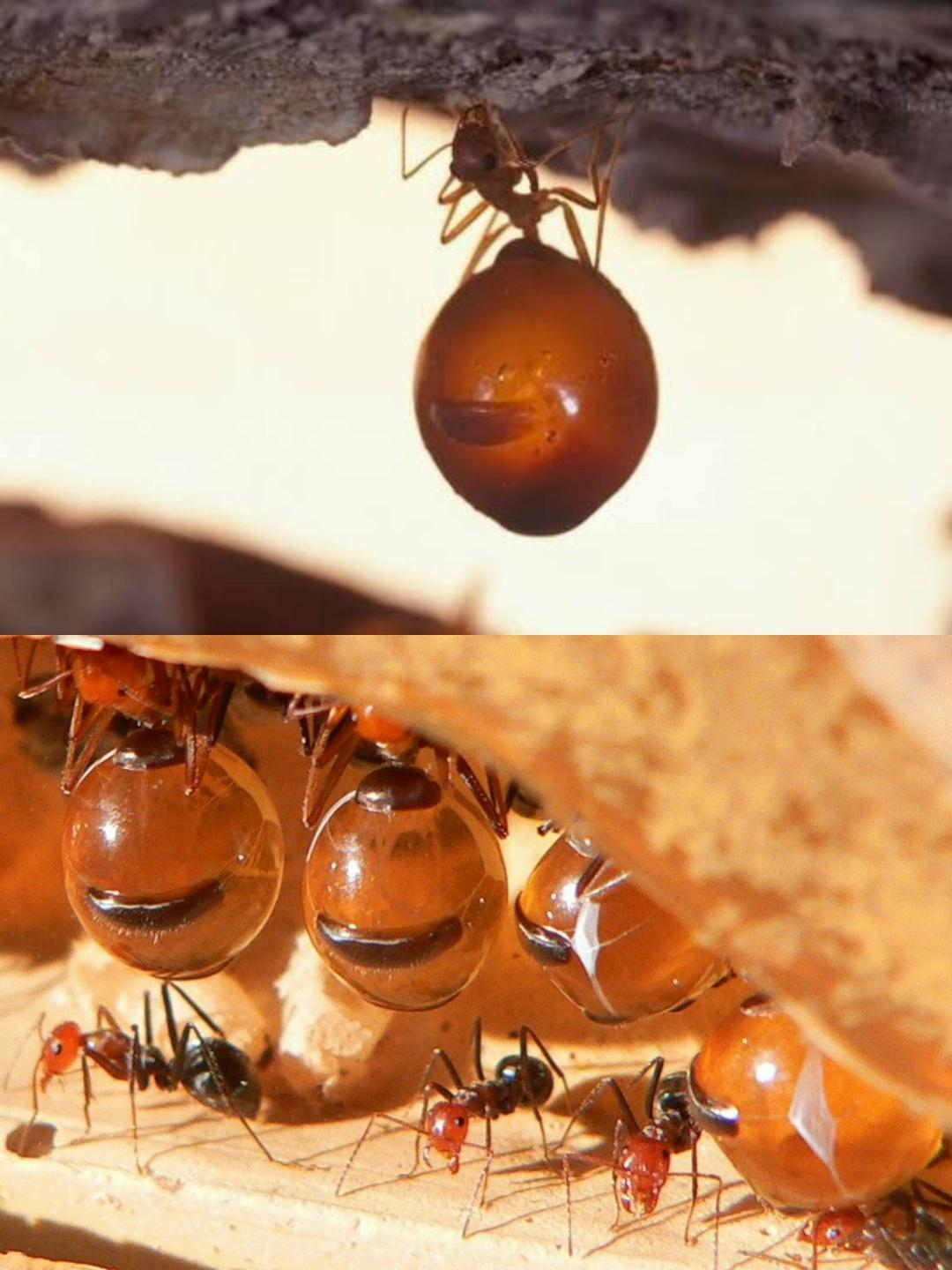 Это медовые муравьи. Они питаются «медовой росой» — это сок растений с высоким содержанием сахара. Источником сладкой росы является растительная тля. Избыток сладкой росы тля оставляет на листьях растений, а муравьи потом с удовольствием ее съедают. Благодаря этому насекомые и получили свое название.