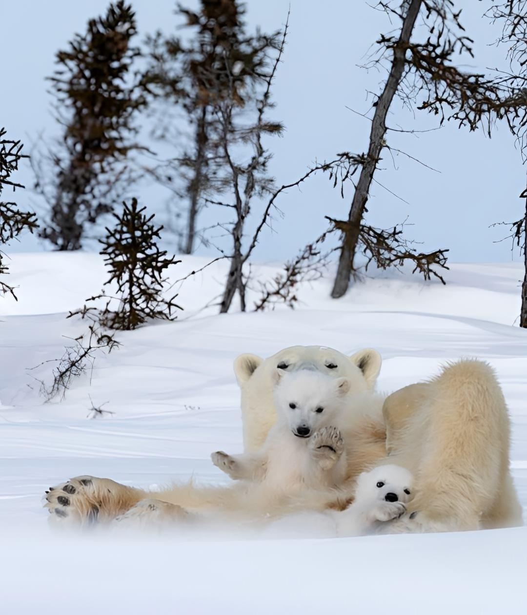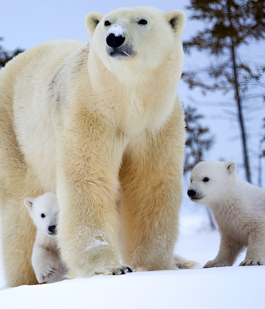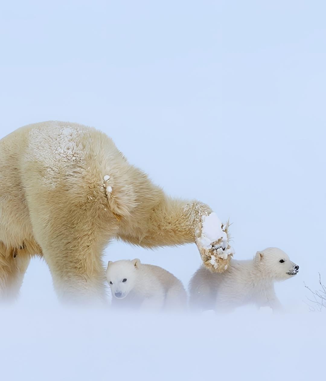 Только взгляните, как белая медведица ведёт своих малышей через суровую арктическую тундру Вапуска.