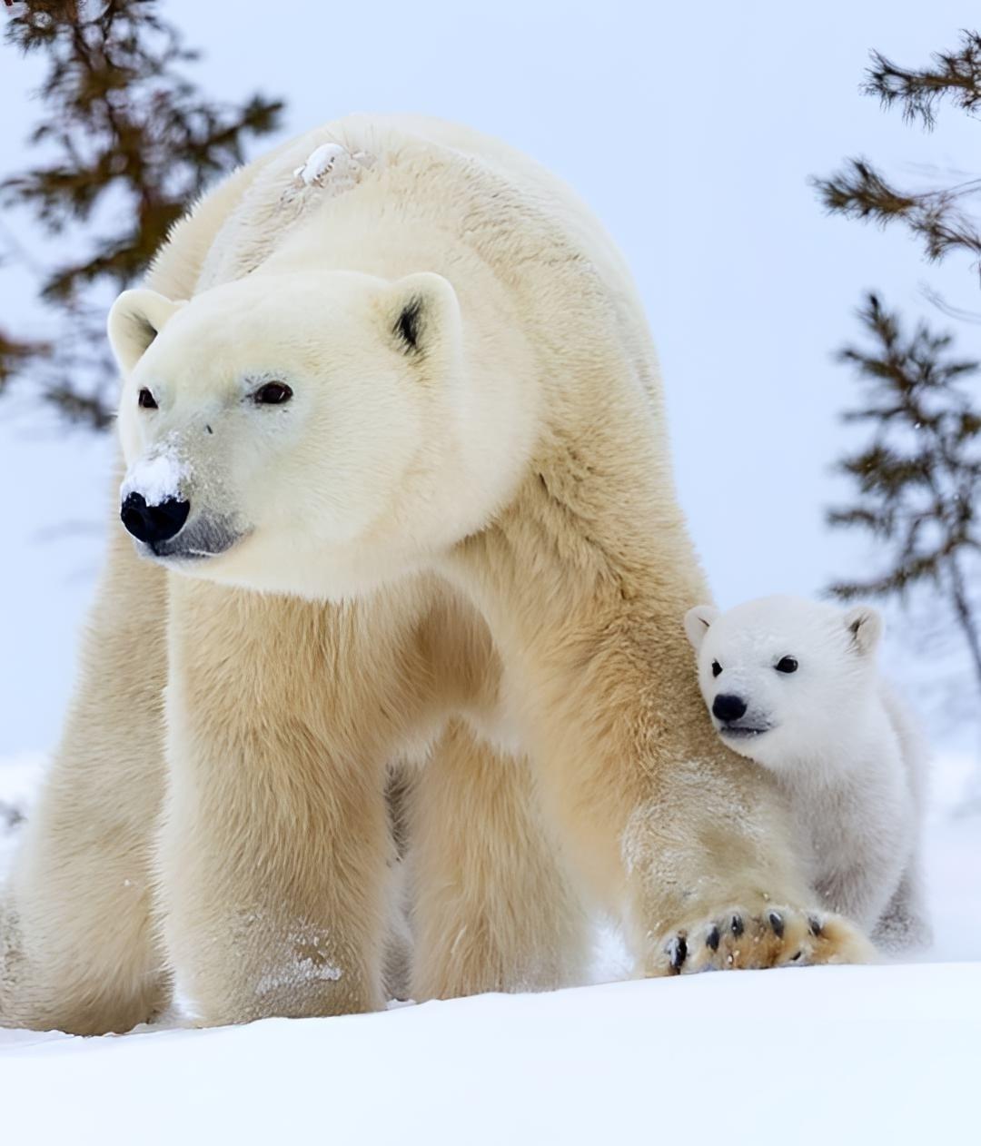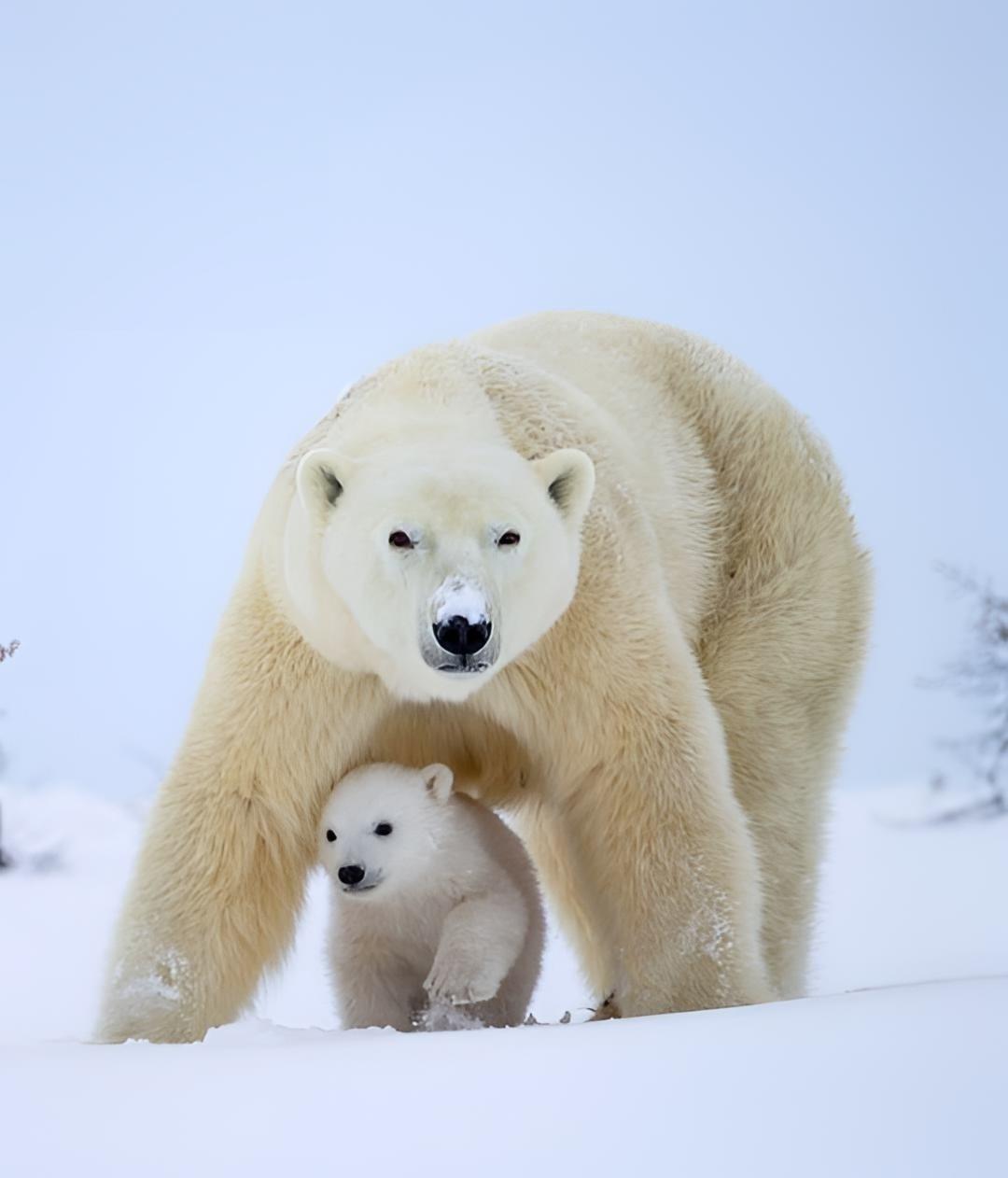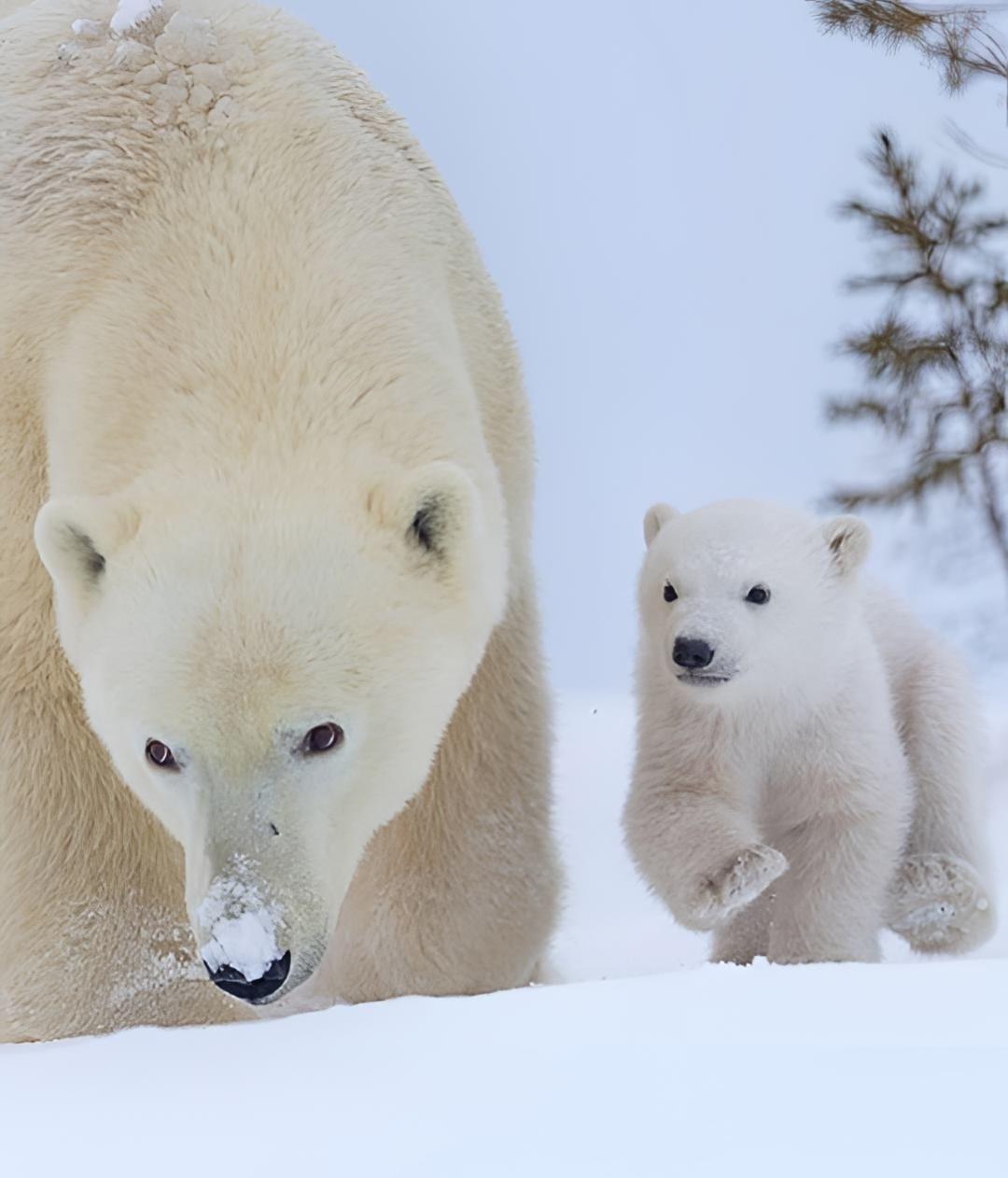 Только взгляните, как белая медведица ведёт своих малышей через суровую арктическую тундру Вапуска.