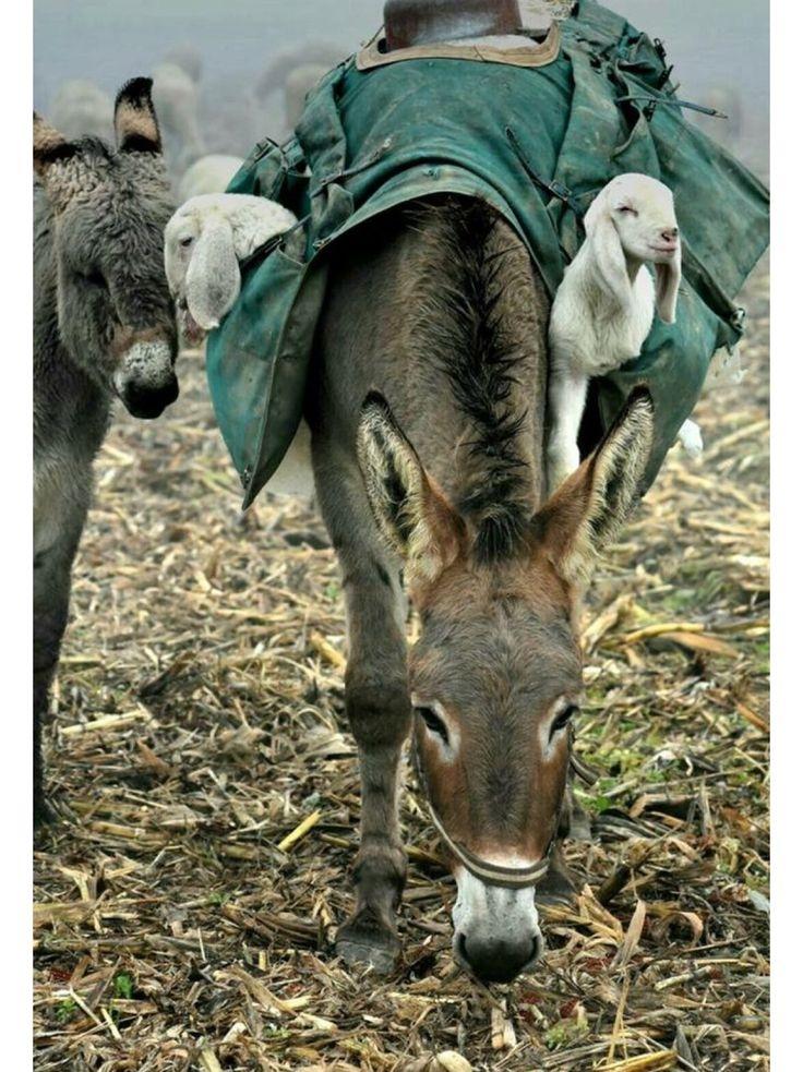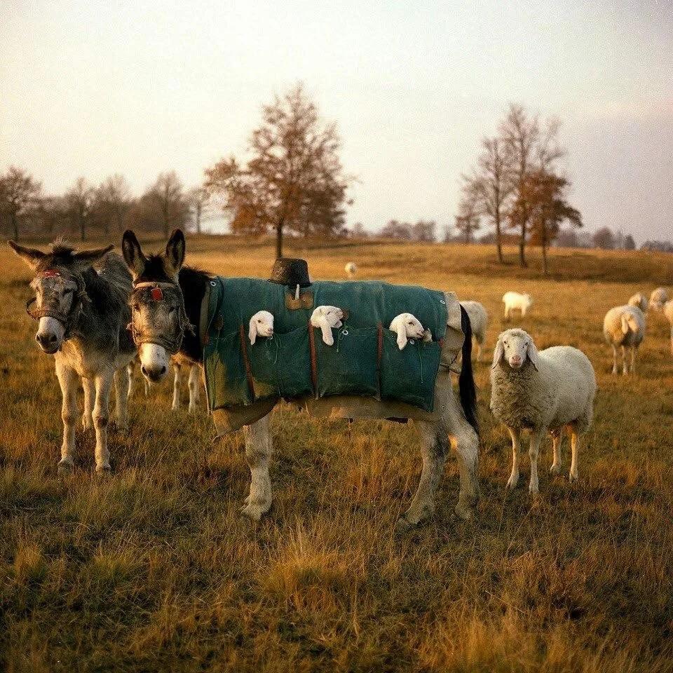 На этом милом фото изображены ослы и мулы в специальных попонах, в кармашках которых сидят еще совсем маленькие ягнята.
