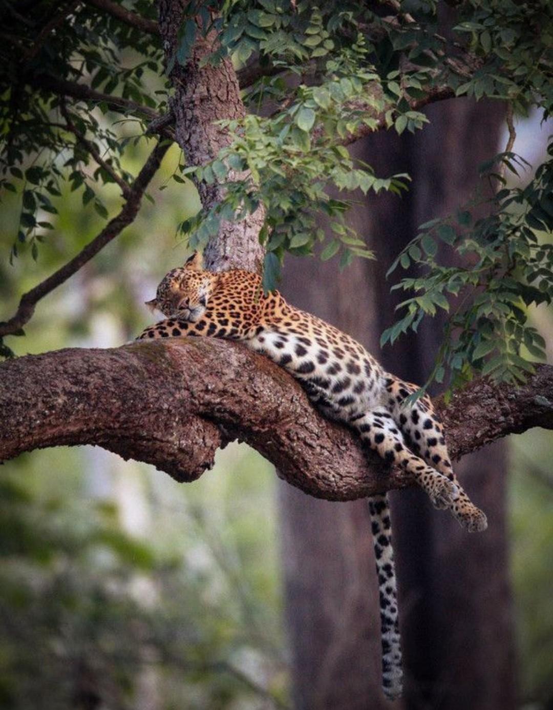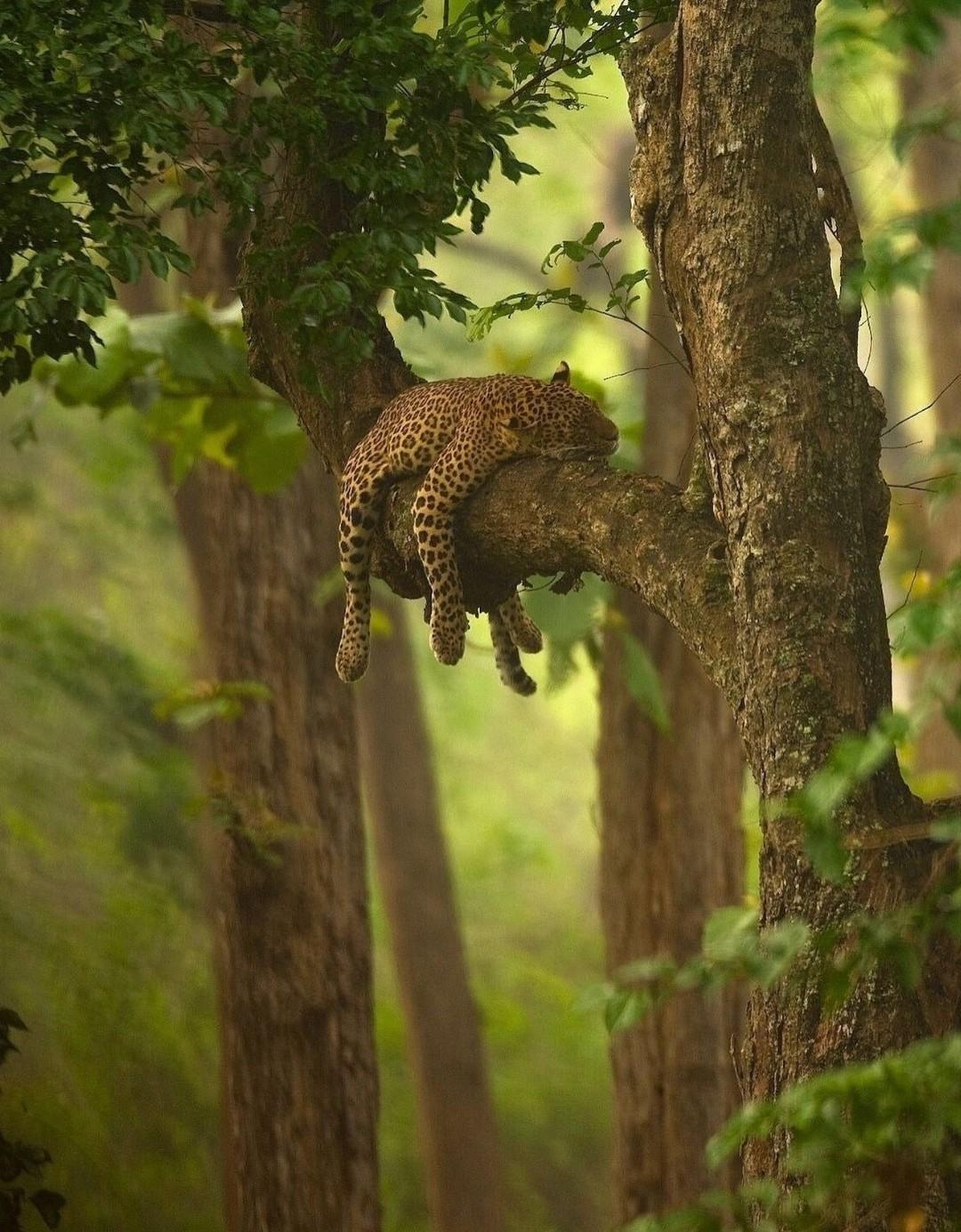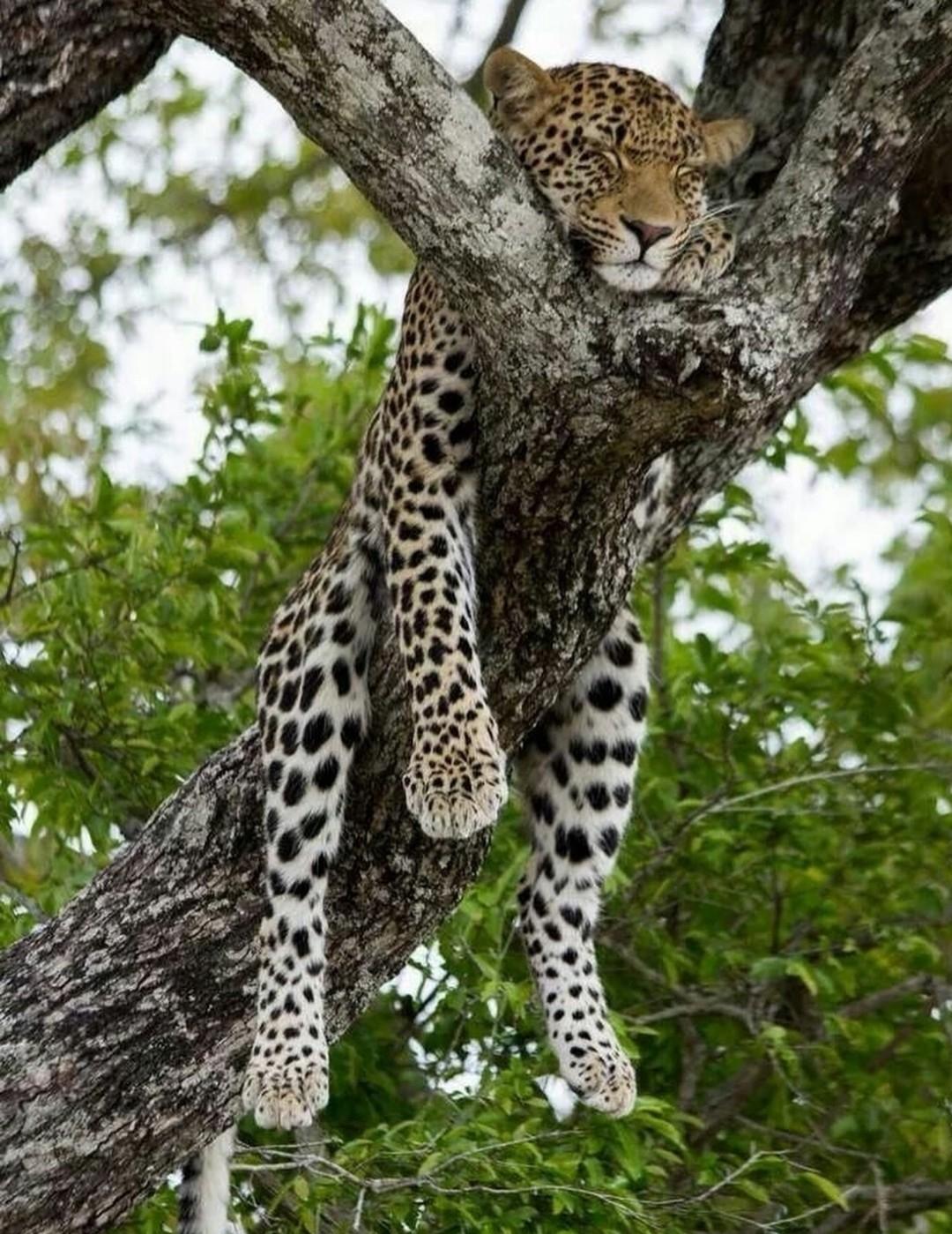 Поднимается на дерево, устраивается на широкой ветке и свешивает лапы так, будто это его личный балкон. А если охота была удачной — ещё и ужин подтянет с собой.
