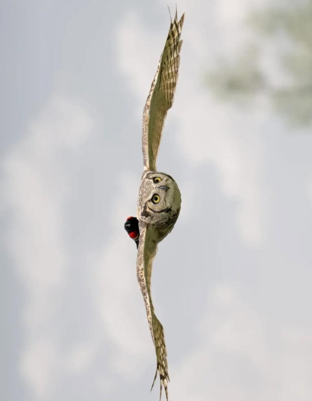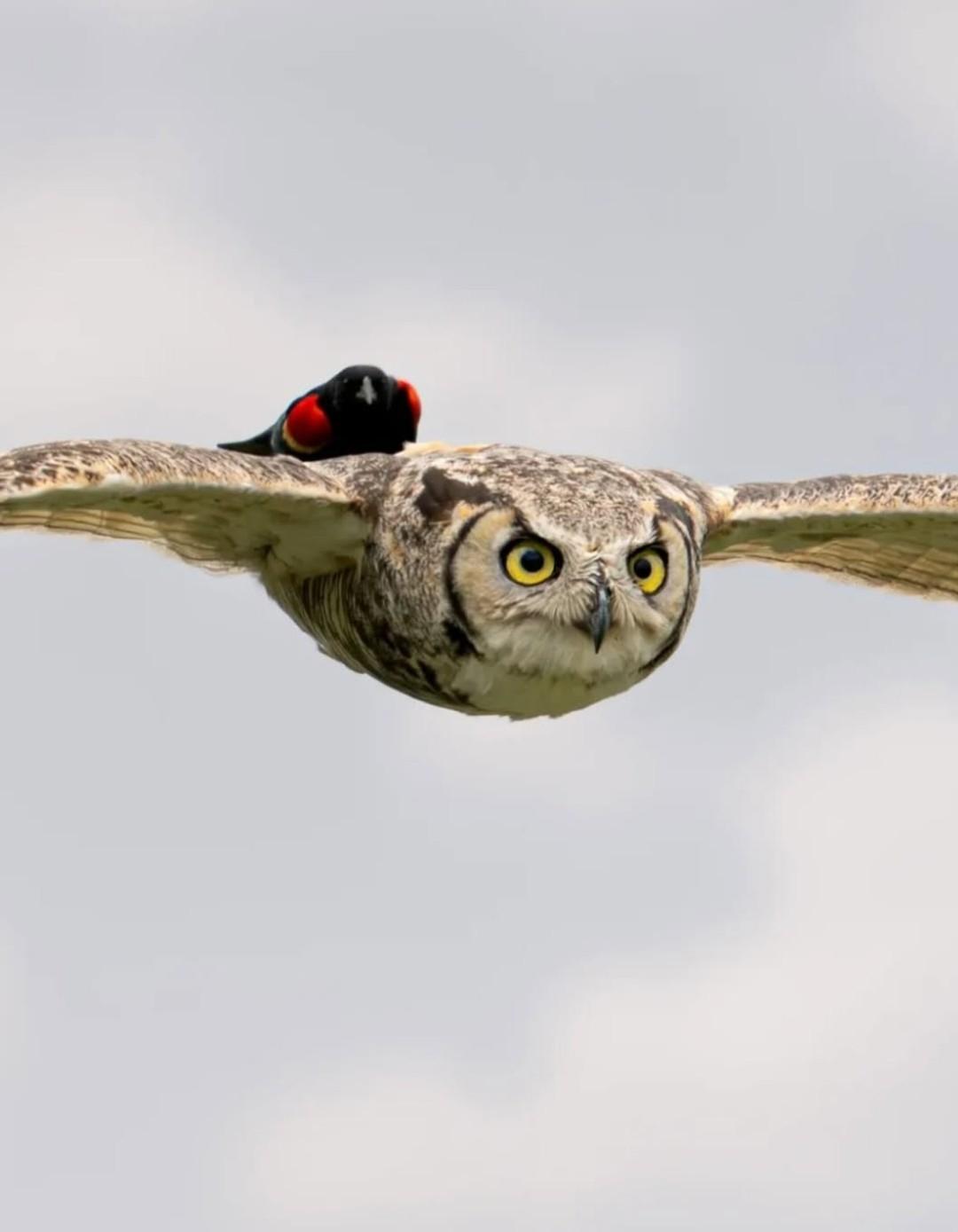 Летишь себе спокойно, по важным совиным делам. И вдруг понимаешь, что у тебя на спине пассажир. Билет он, судя по всему, не покупал. Кадр поймал Мэтт Кроссли — и это чистая небесная комедия.