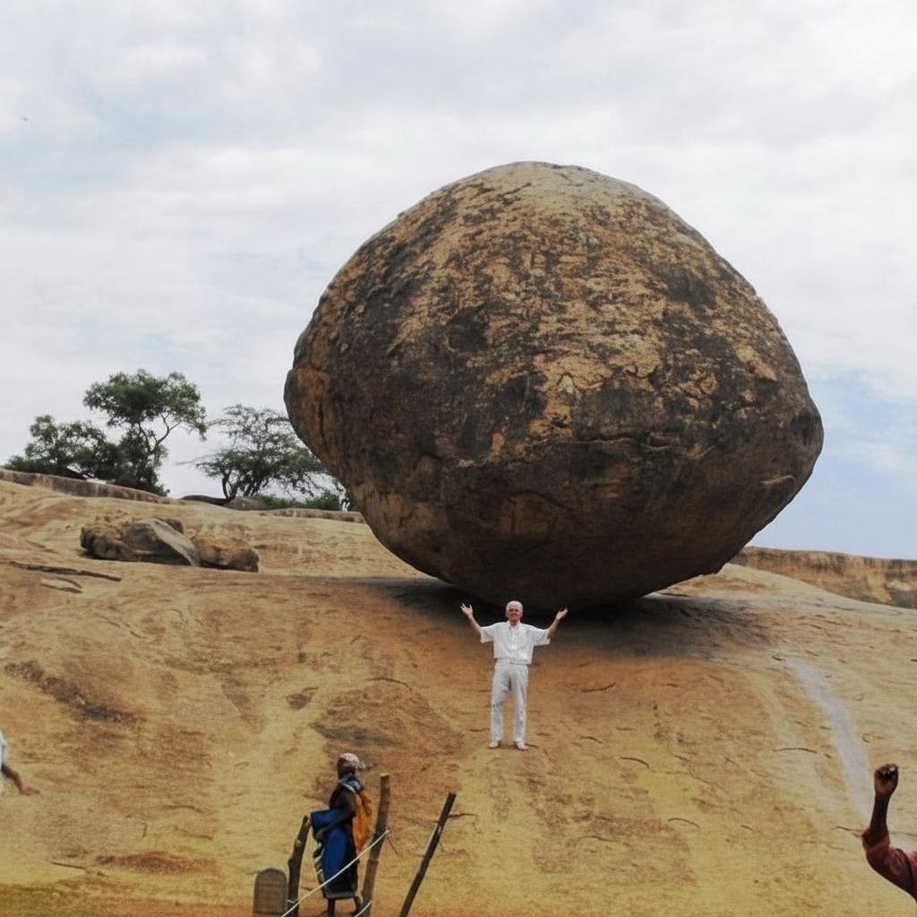 «Масляный шарик Кришны» — это гигантский гранитный валун весом 250 тонн и высотой 6 метров, который завис на склоне холма. Он не скатился вниз. Валун находится в этом положении более 2000 лет.
