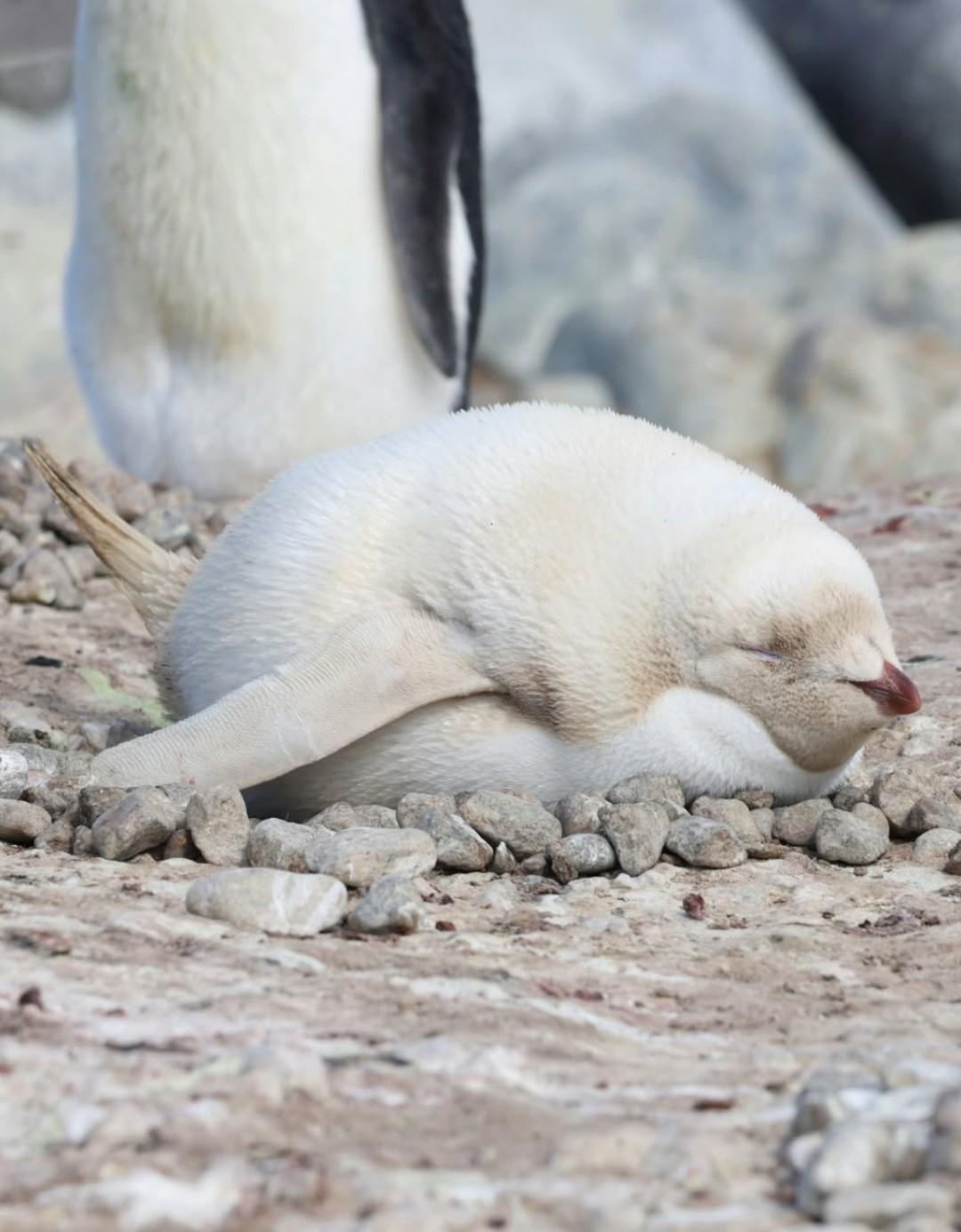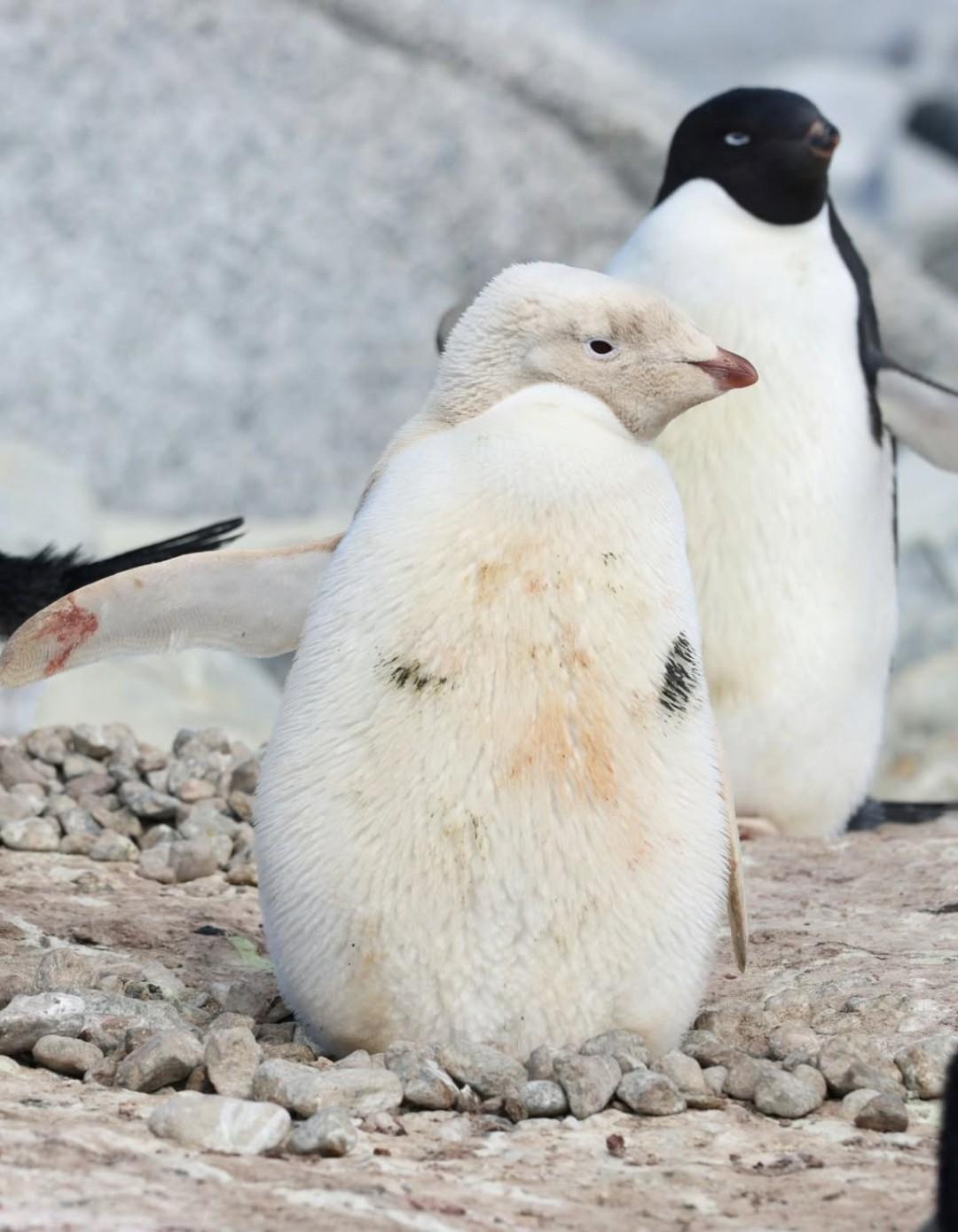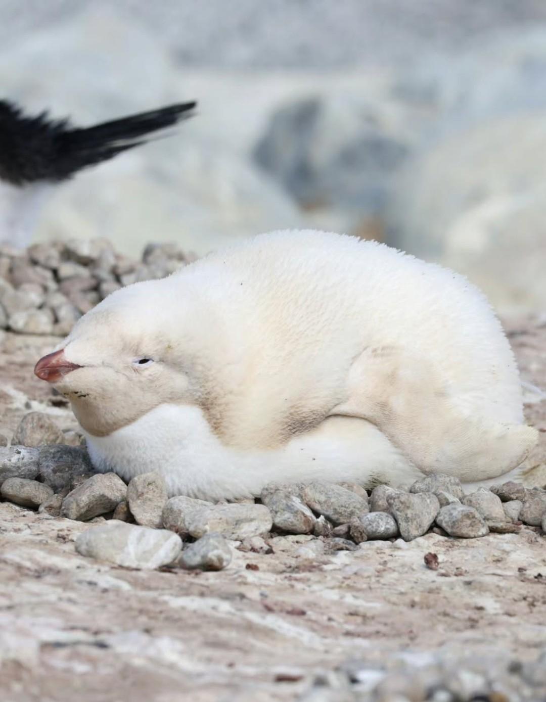 Это Айви — пингвин Адели 🐧 Иногда у пингвинов встречается лейцизм — особенность, при которой часть пигмента теряется. Из-за этого перья становятся белыми или очень светлыми — частично или почти по всему телу.