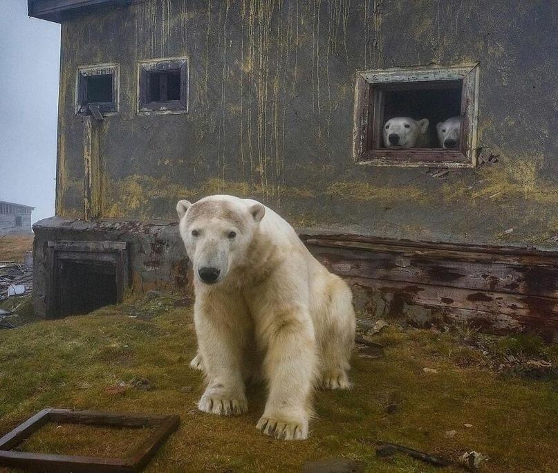 Российский фотограф Дмитрий Кох запечатлел белых медведей на территории заброшенной метеостанции на острове Колючин в Чукотском море. Станция была построена в 1934 году и закрыта в 1992-м, а сегодня её пустые здания стали частью сурового арктического пейзажа.