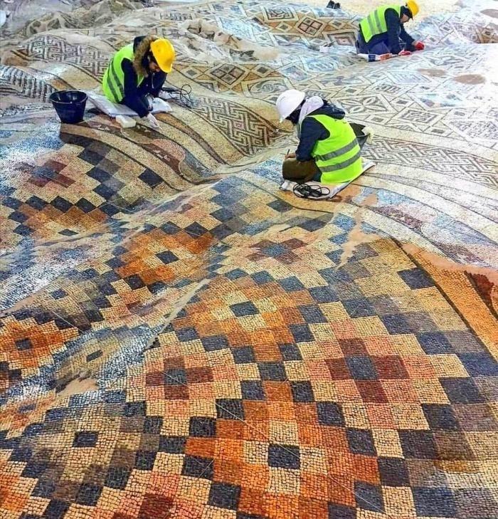 Один из крупнейших сохранившихся римских мозаичных полов, обнаруженных во время строительства отеля в Антакье (Турция) на месте древней Антиохии. Эффект искривления был вызван землетрясениями и создает впечатление гигантского лоскутного одеяла.